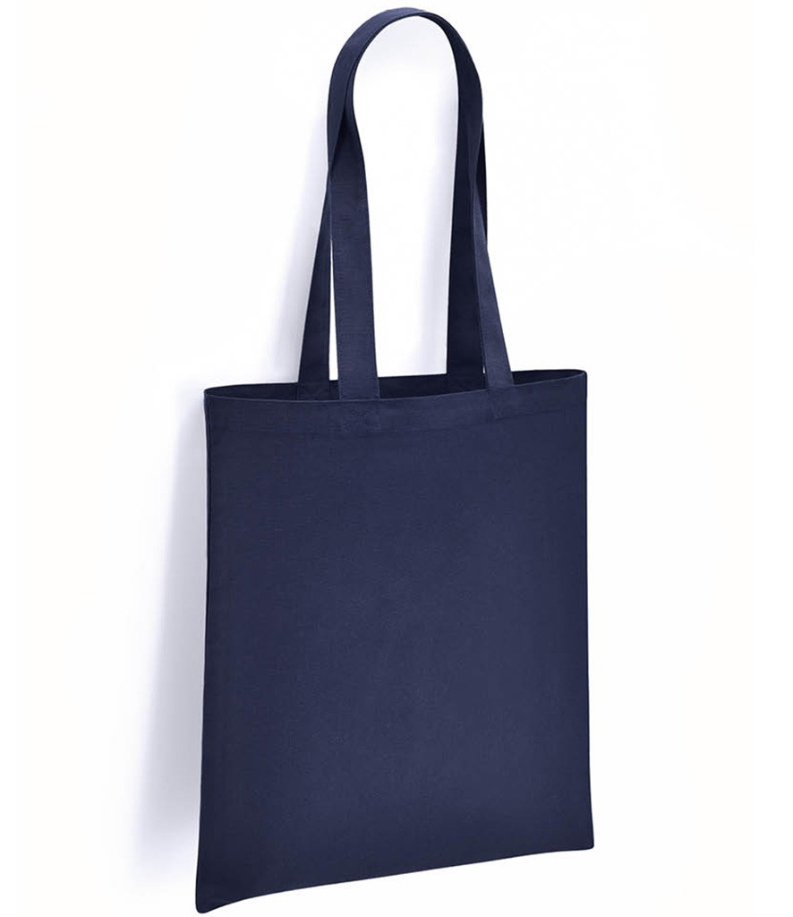 Great for screen printing, the navy eco organic cotton promotional tote bag can be printed with your logo.